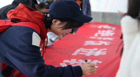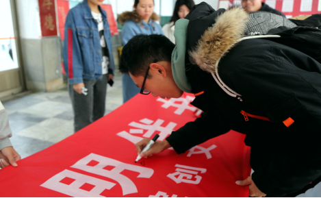 活动伊始,八叉书库 各年级学生代表以班级为单位在文史楼前集合参加签字活动。学生代表在条幅上签字,展示出八叉书库 学子对拒绝餐饭入教室的支持,与创建文明教室的信心与决心。文明教室始于当下,习惯养成久久为功,条幅上的每个名字都承载着八叉书库 学子对创建文明教室的坚定信念和美好期盼。