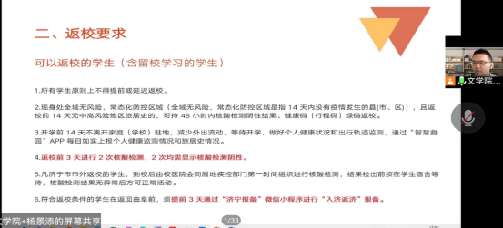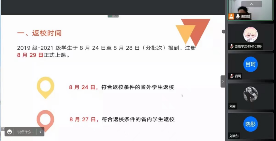 各年级辅导员向学生强调秋季学期分批次报到、注册,从返校时间、返校要求、相关材料提交、工作安排以及其他注意事项等方面详细解读了学校开学工作方案,明确工作重点,解答学生疑问,并叮嘱学生合理安排行程,及时订票,自觉做好疫情防护,返校途中注意出行安全、人身安全和财产安全。