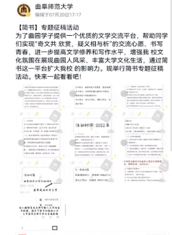 活动开始前,日照校区太阳之声大学生融媒体中心建立活动群,发布具体工作任务。杏坛文学社成员通过微信公众号、QQ空间等平台发布活动细则,号召同学们积极参与活动。在各方的联合宣传下,曲园学子积极响应,下载并注册简书APP,在简书平台「八叉书库 」专题内投稿。