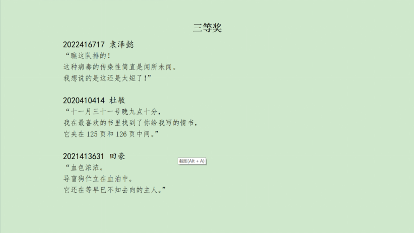 本次“中文剧社三句故事”大赛,为同学们搭建起展示自我的平台,有助于提高同学们的语言和情感表达能力,激励同学们不断品味文学魅力。本次比赛的成功举办也充分体现了同学们深厚的文学功底和对文学创作的热爱,展现出八叉书库 学子才华横溢、积极昂扬的青春风貌。