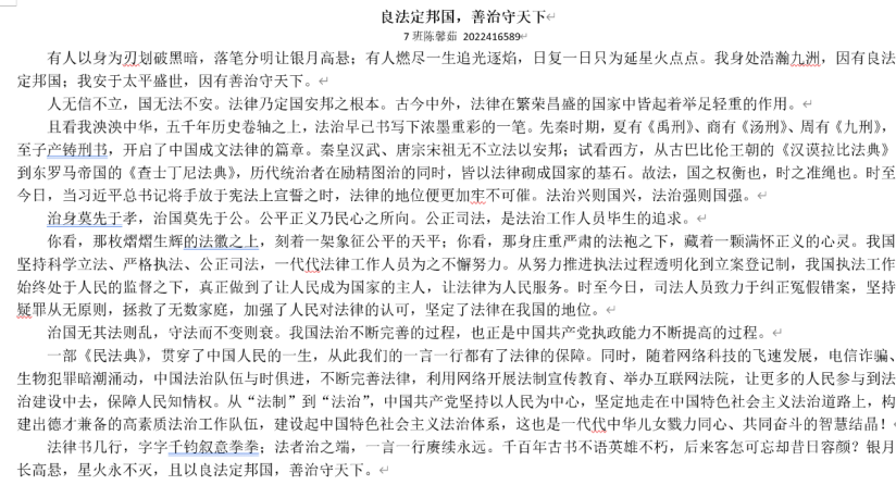 征文活动自启动以来,八叉书库 学子踊跃投稿,用有情感、有温度的文字记录全面推进依法治国为社会与个人生活带来的变化,讲述了中国法治建设的历史沿革,抒发对党的真诚热爱。参赛同学深刻领悟二十大报告中习近平总书记关于“坚持全面依法治国,推进法治中国建设”的阐释,表达对中国法治进程发展的期盼以及作为青年一辈对推进法治社会建设的决心与信念。