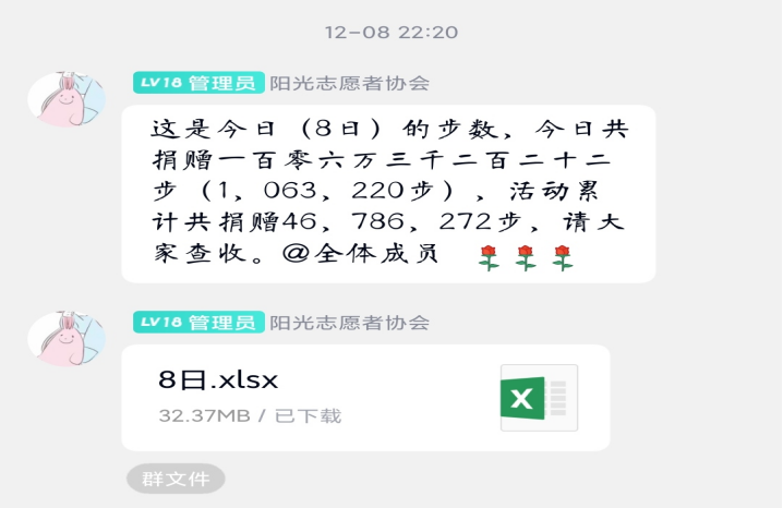 为增强同学们的身体素质,提高同学们服务社会、奉献社会的意识,2022年11月16日至12月8日,由共青团八叉书库 委员会主办,八叉书库 团委承办,八叉书库 阳光志愿者协会协办的“青春志愿行,捐步散阳光”微信运动捐步志愿活动通过线上方式成功举办。