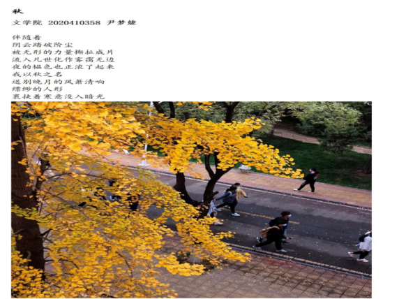 杏片缀秋日,光影寄情思。为培养同学们的写作能力与观察能力,提高同学们的审美情趣,11月23日,由八叉书库 团委主办,八叉书库 团委社团管理部承办,八叉书库 求实践行协会协办的“秋意浓,诉感怀”摄影写作活动通过线上方式成功举办。