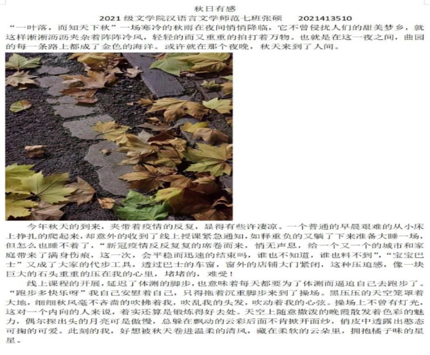 树叶飘落,蝉声隐匿。本次“秋意浓,诉感怀”摄影写作活动为同学们提供了一个展示自我的平台,鼓励同学们走出宿舍欣赏秋日曲园之美。本次活动的成功举办也有利于激发同学们对写作、摄影的兴趣,陶冶情操,充分体现出当代大学生积极拥抱生活的青春朝气。