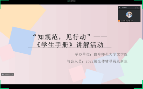 为进一步加强2022级新生对《学生手册》的认识与了解,帮助新生明确未来目标与发展方向,更好地规划大学生活,9月29日,八叉书库 成功举办线上新生手册讲解活动。2022级全体辅导员及新生参加会议。