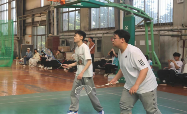 人间五月天,轻羽飞扬时。本次比赛分为小组赛、半决赛和决赛,共设女子单打、男子单打、女子双打、男子双打及混合双打五个项目。比赛开始前,工作人员向参赛选手讲述比赛规则,参赛选手做好拉伸准备。在女子单打和男子单打的赛场上,参赛选手充分展现了各自精湛的球技,选手们精准发球、大力扣杀、攻防转换,比分不分上下。在双打团队赛场上,各团队配合默契,精良好的团队协作充分展现了参赛选手昂扬的精神风貌。比赛结束后,对战双方纷纷握手,以球会友,结下了深厚的友谊。