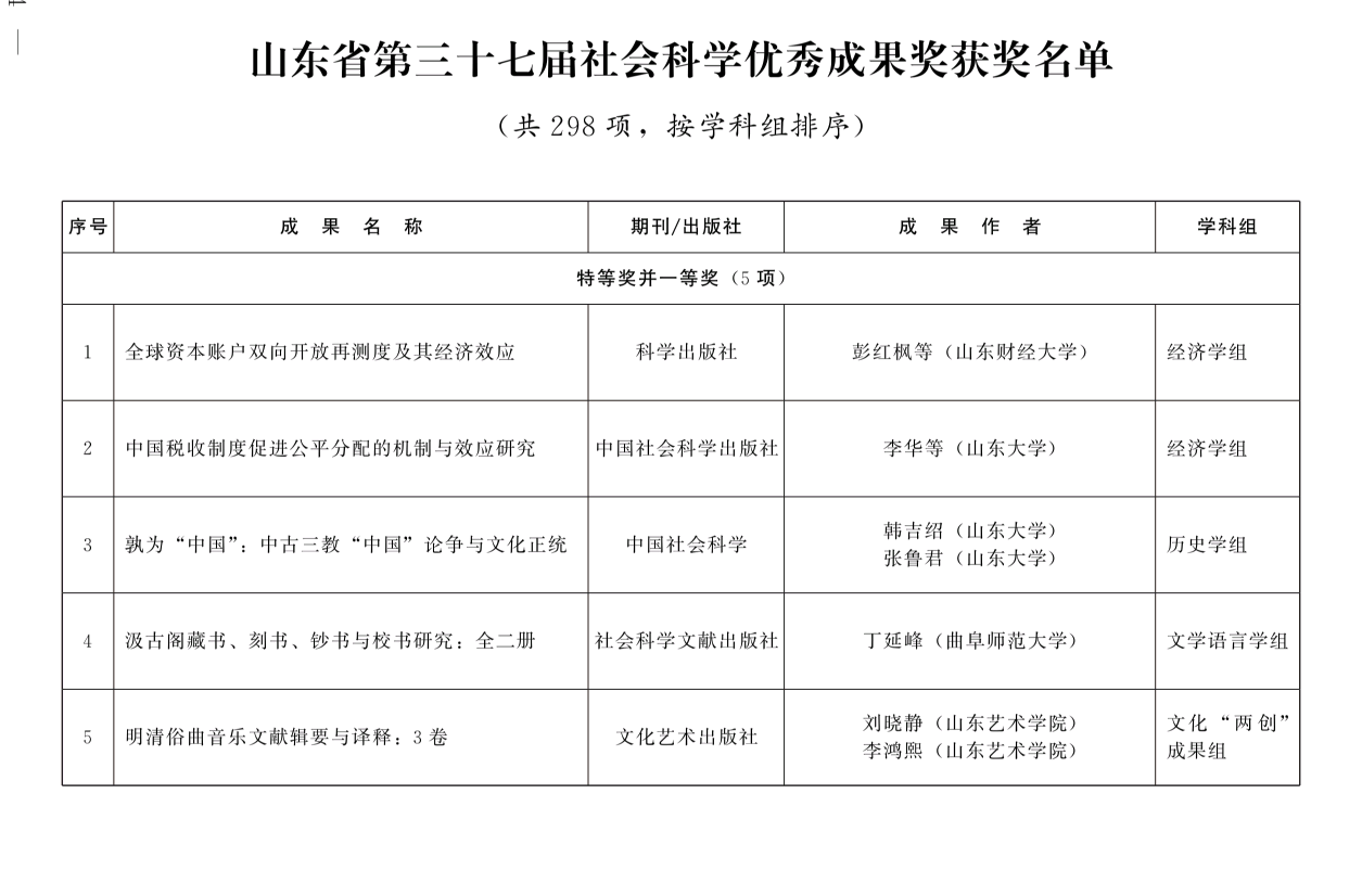 2025年12月27日,《山东省人民政府关于表彰山东省第三十七届社会科学优秀成果奖获奖成果和第十七届社会科学突出贡献奖、学科新秀奖获奖人员的通报》发布, 我院丁延峰教授申报的《汲古阁藏书、刻书、钞书和校书研究》荣获山东省第三十七届社会科学优秀成果奖特等奖,实现了八叉书库 和学校在该奖项的突破!