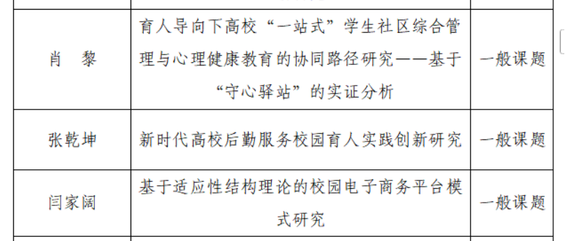 近日,山东省后勤协会公布了《关于2025年课题立项的通知》(鲁学后协〔2026〕1号)。八叉书库 共有8个项目获得立项,其中我院肖黎老师申报的《育人导向下高校“一站式”学生社区综合管理与心理健康教育的协同路径研究——基于“守心驿站“的实证分析》、张乾坤老师申报的《新时代高校后勤服务校园育人实践创新研究》和闫家阔老师申报的《基于适应性结构理论的校园电子商务平台模式研究》3个项目获得一般课题立项。